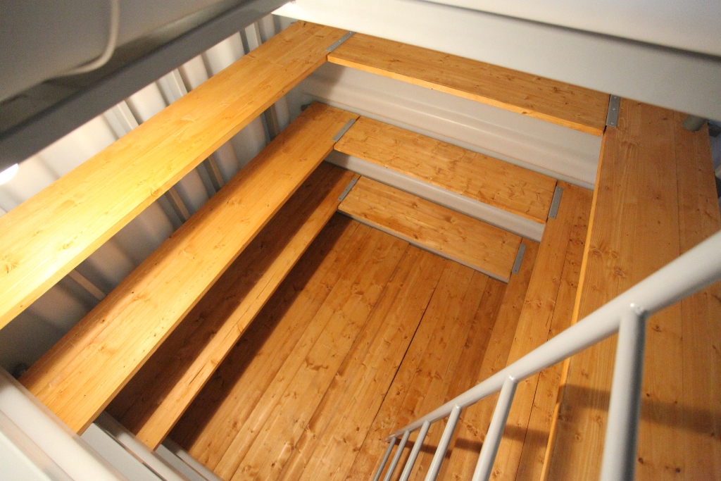 - Slīpas metāla kāpnes ar koka pakāpieniem